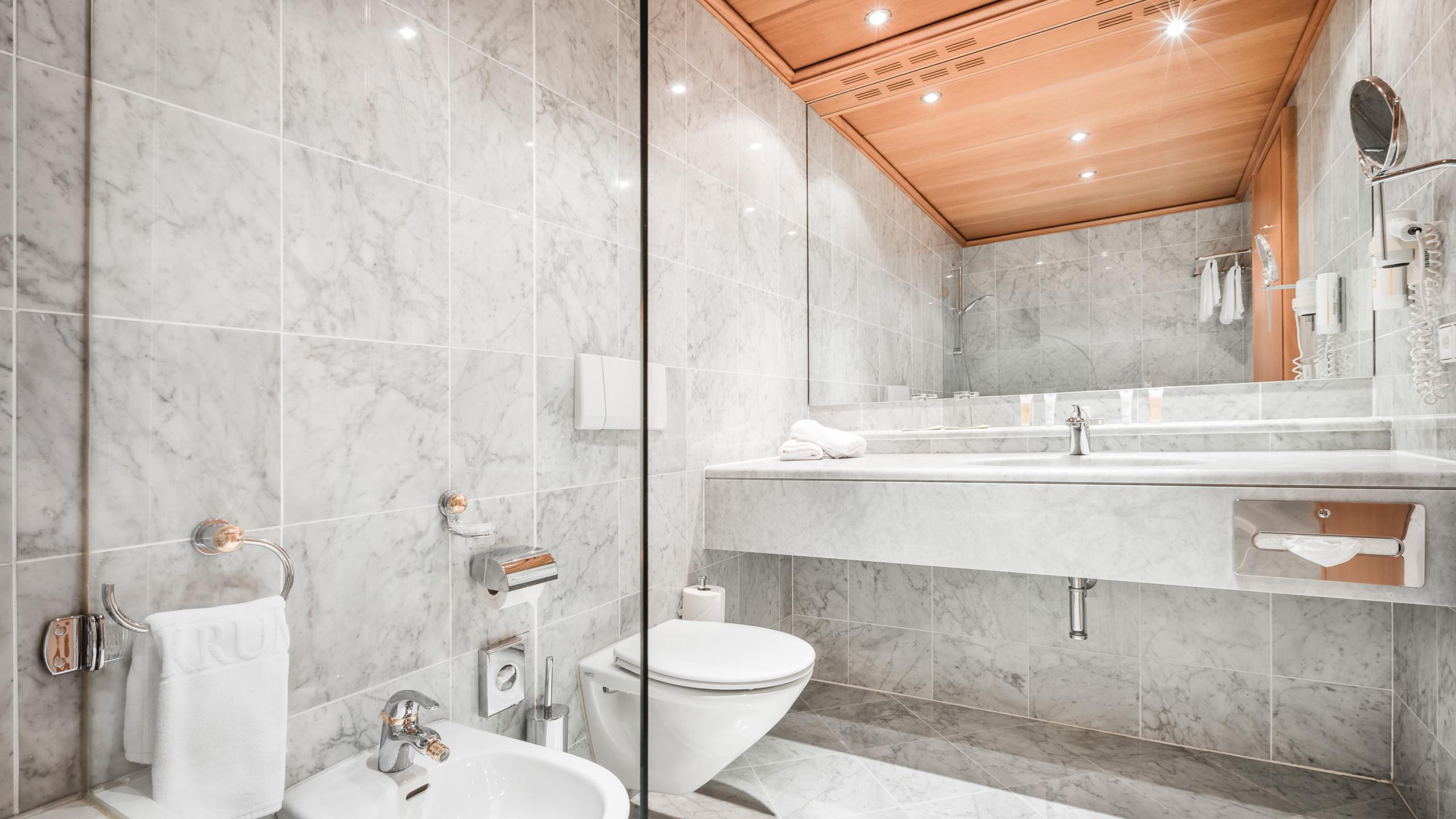 The junior suite (approx. 40 m²), is appropriate as a family room. The spacious corner balcony facing west is sensational, offering you a fantastic panoramic view of the Wetterstein mountains or in part with view in the wood. The rooms have a desk and seating area, extra bed, bathroom with bathtub, bidet, flat screen TV, radio, minibar, safe, WLAN. During your stay we also provide you with our spa bag with cosy bathrobe, towels and slippers.